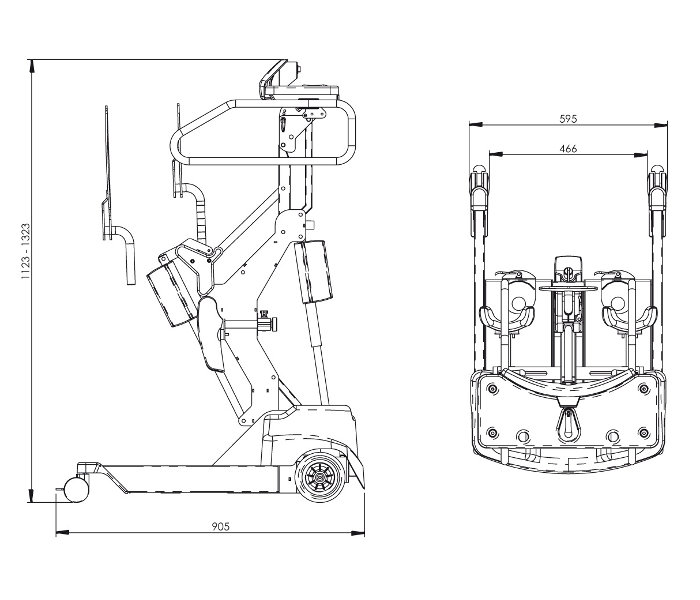 La mise en position debout s’opère au moyen d’un moteur (24 V) alimenté par des batteries rechargeables et une commande manuelle à boutons poussoirs. Une assise en forme de selle permet le transfert aisé qui, grâce au système pantographe, suit la course jusqu’au redressement complet.