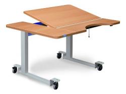 Een ergonomische en comfortabele ergotafel met bovenblad in drie delen, waarvan één vast deel links, één deel in hellingsgraad verstelbaar rechts en een voorste deel met uitsparing. De tafel biedt diverse opties en is geschikt voor rolstoelgebruikers.